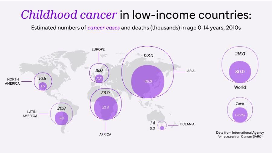 In developed countries, children with cancer get a proper diagnosis and have access to good treatments. In developing countries, even if parents are aware their child has a problem, it can be difficult to find a practitioner with expertise - the average pediatrician has chance of seeing on child with cancer every year or two, and in places like sub-Saharan Africa, there may be only one or two pediatric oncologists in the entire country.