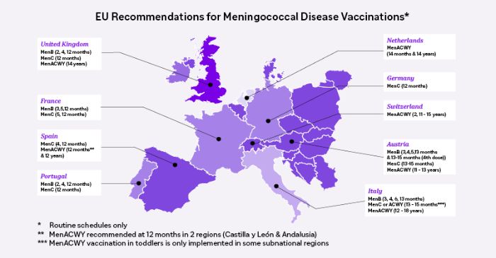 - European Centre for Disease Prevention and Control (ECDC), 2022. Vaccine Scheduler. Meningococcal disease, recommended vaccinations. Available at: https://vaccine-schedule.ecdc.europa.eu/Scheduler/ByDisease?SelectedDiseaseld=48&SelectedCountryldByDisease=-1